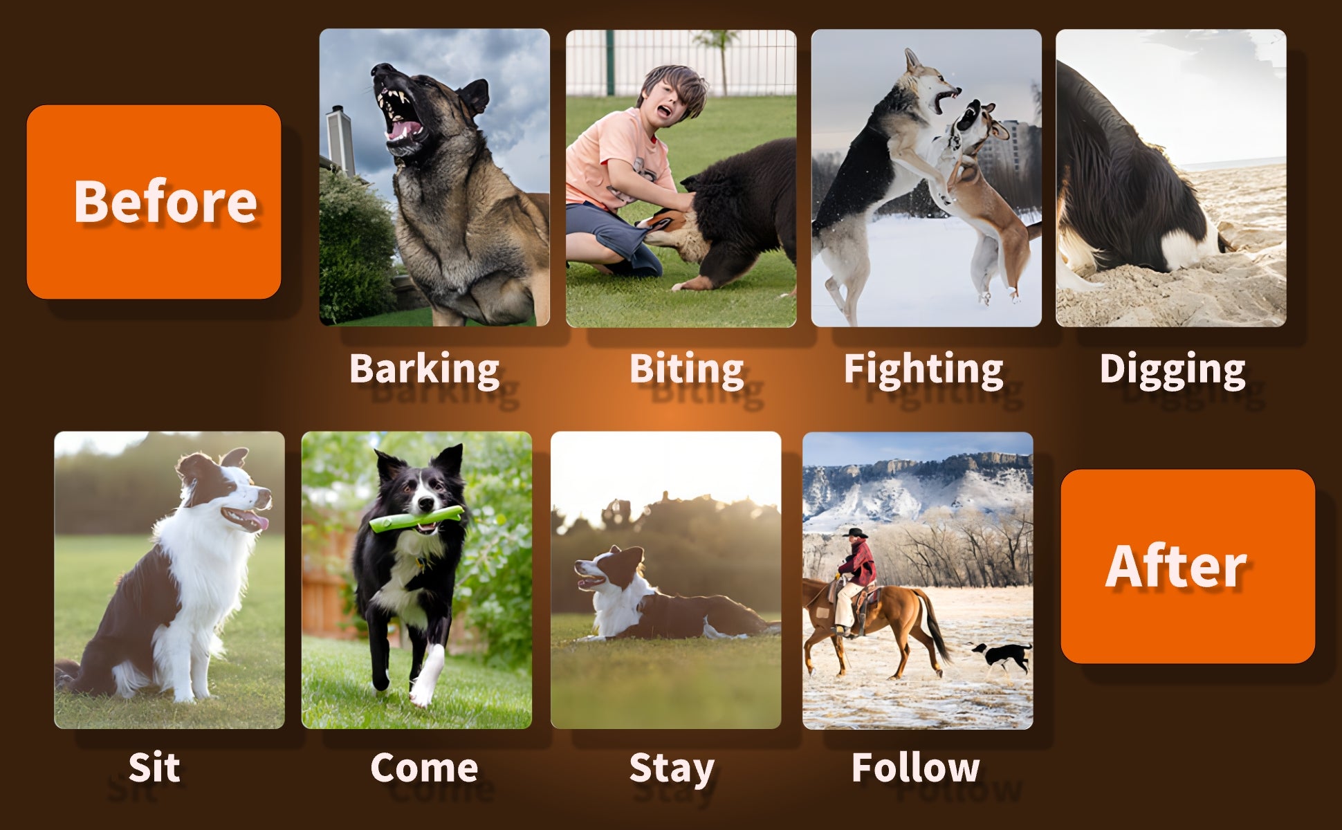 3 Effective Training Modes: Vibration(0-18 levels), Strong vibration(0-18 levels) and Sound, you can choose the suitable mode to train your dogs,and correct the dog's bad behavior more effectively.Digging,Barking,Biting,Recall, Fighting......etc.
