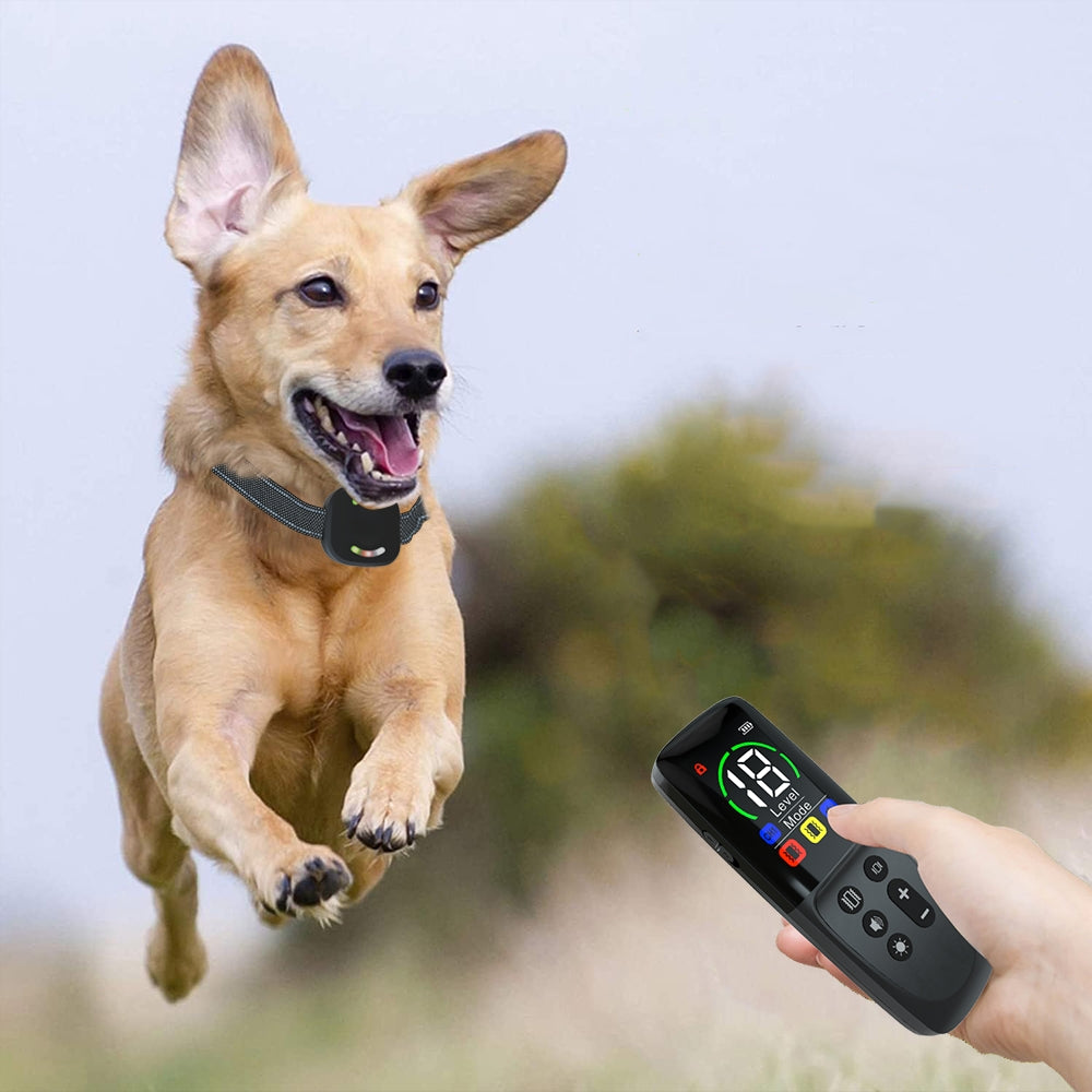 Dog training collar with 4 training modes:Light(LED Dog Finder),Beep,Vibration(1-18 Levels),Strong Vibration(1-18 Levels),The humanized and safe training collar enables you to customize the appropriate stimulation level according to the dog's personality and reaction,and correct the dog's bad behavior more effectively.Digging,Barking,Biting,Recall, Fighting......etc.