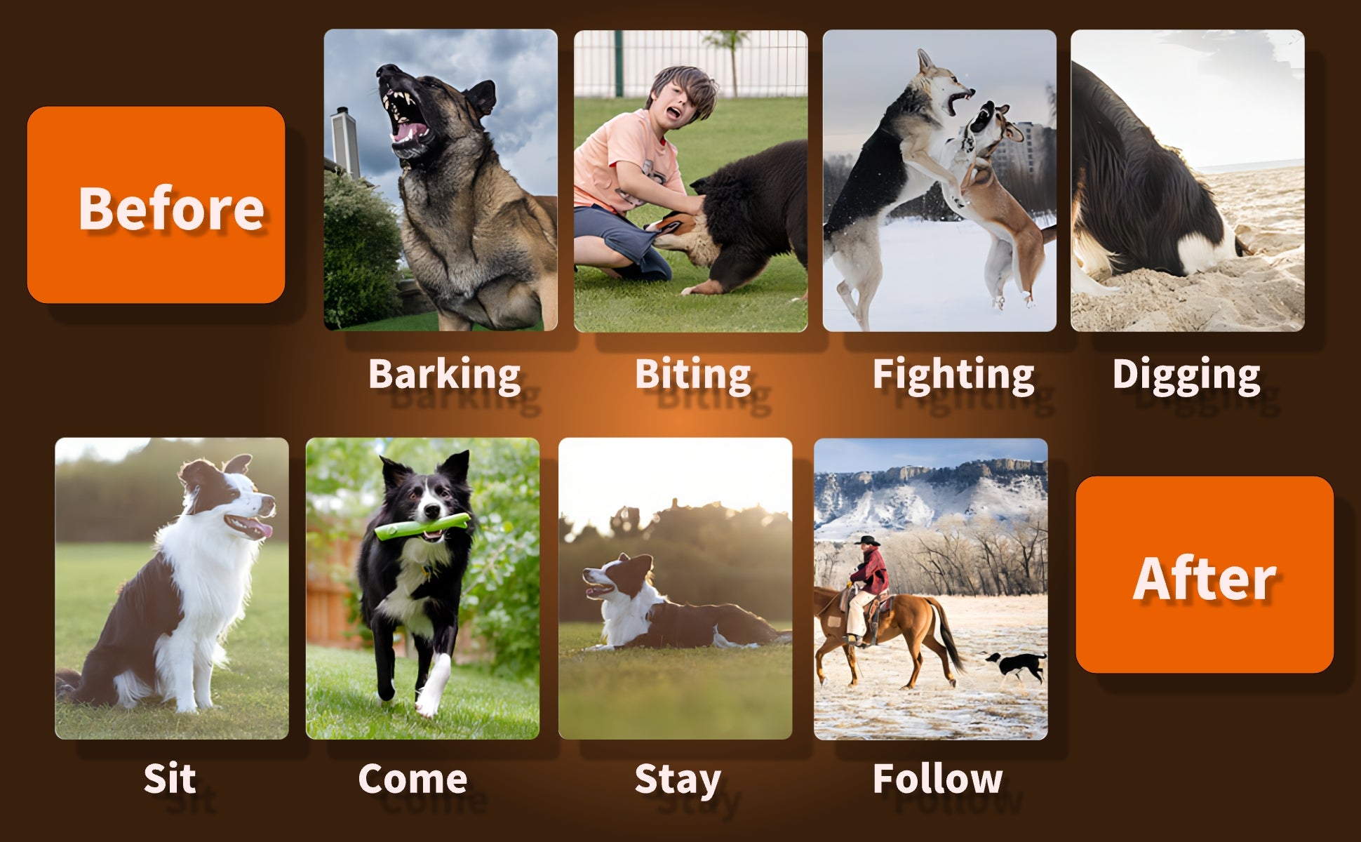 3 Effective Training Modes: Vibration(1-16 levels),Strong vibration(1-16 levels) and Sound, you can choose the suitable mode to train your dogs,and correct the dog's bad behavior more effectively.Digging,Barking,Biting,Recall, Fighting......etc.